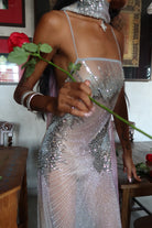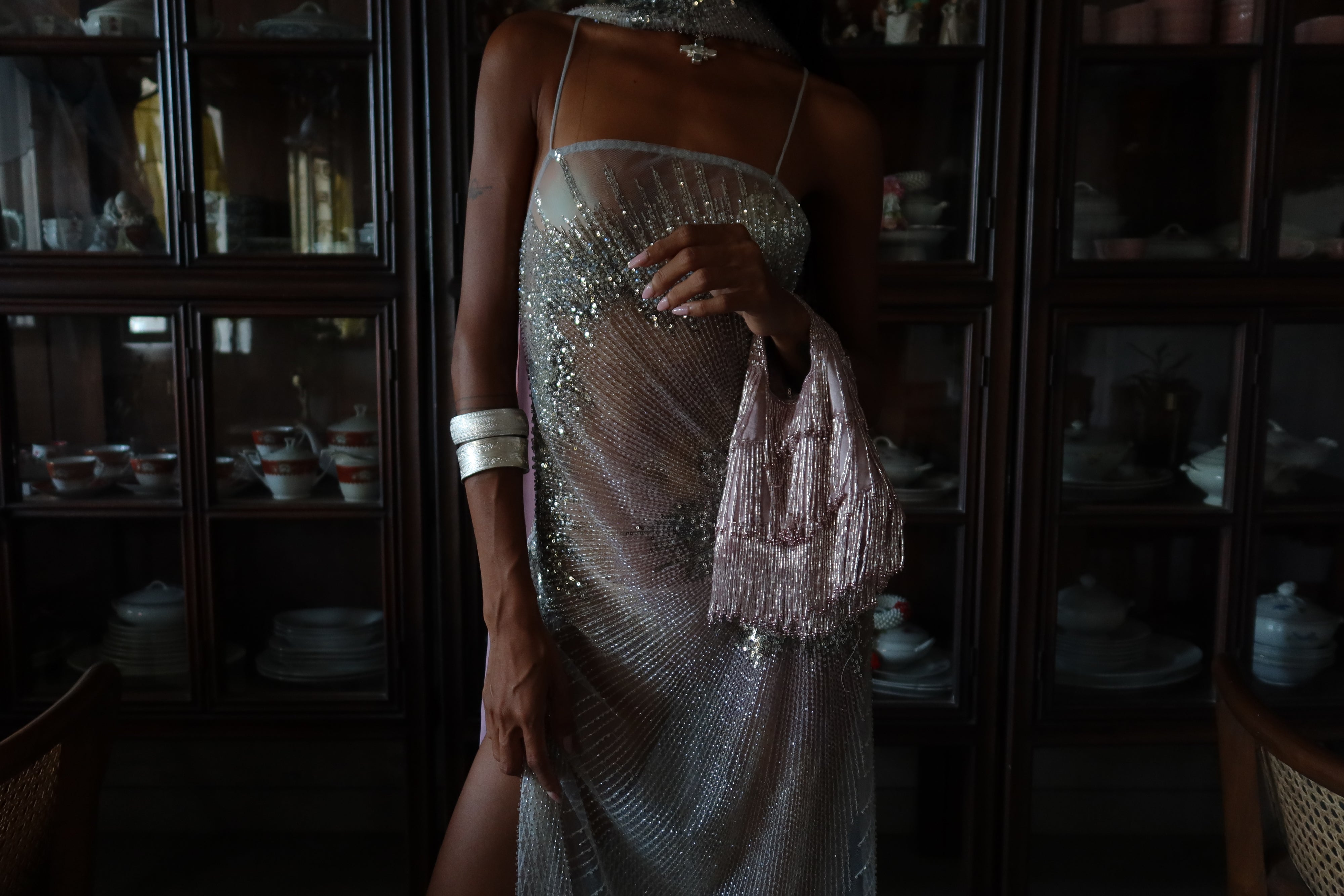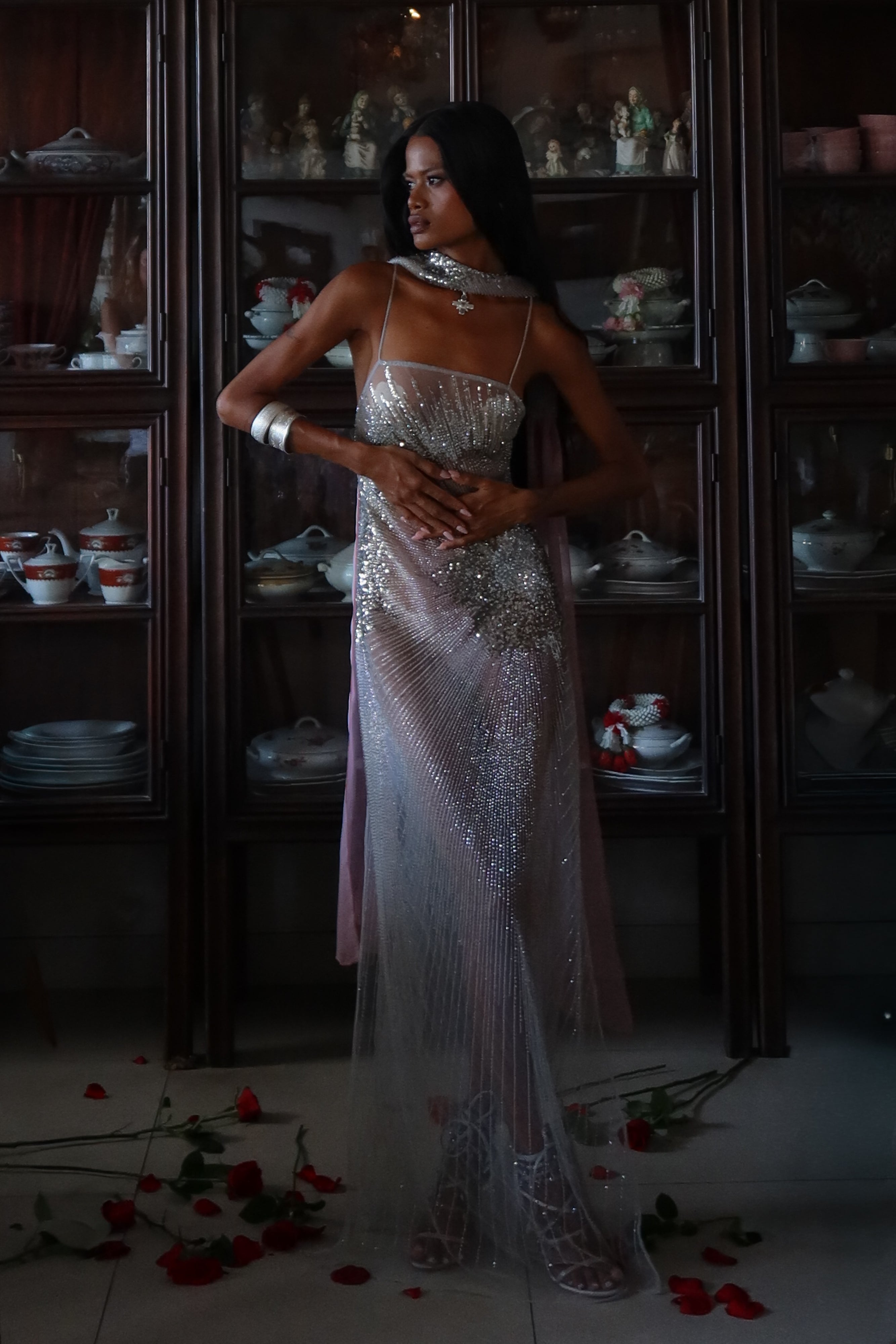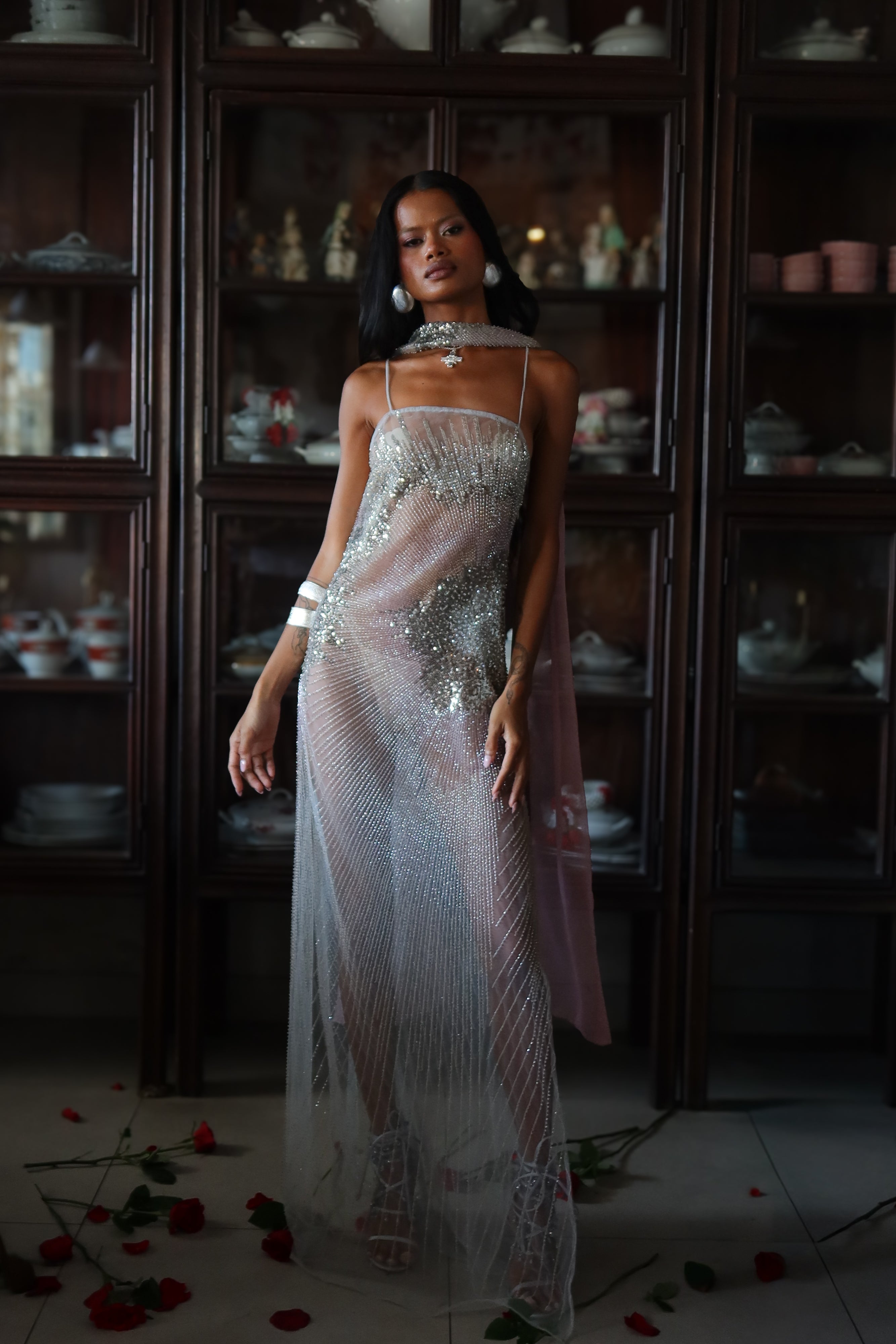 Sheer, sculptural, and quietly unapologetic, it drapes like a dream, tracing the body in soft shadow and starlit shimmer. The silhouette is a study in romantic disorder, delicate ties, intricate texture, and a barely there presence that leaves just enough to the imagination.