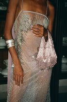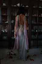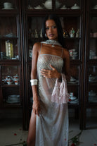 Our best selling Fantasia Dress returns in a luminous new colourway, Fantasia La Nuit. A soft composition of dusky greys, silvers, and lilacs, finished with a matching beaded neck scarf in rose tinted chiffon.
