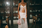 The bra mirrors the skirt’s motif, creating harmony and luminosity across the set. Together, they evoke the image of Aphrodite rising from the sea, radiant, feminine, and unforgettable.