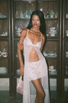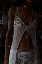 The micro mini skirt is adorned with a custom rhinestone motif that catches the light like sun on saltwater. It is paired with a matching bra top, elevated by three cascading frilled layers that echo the rhythm of waves in motion, each frill finished with hand applied embellishment for a fluid, goddess like effect.