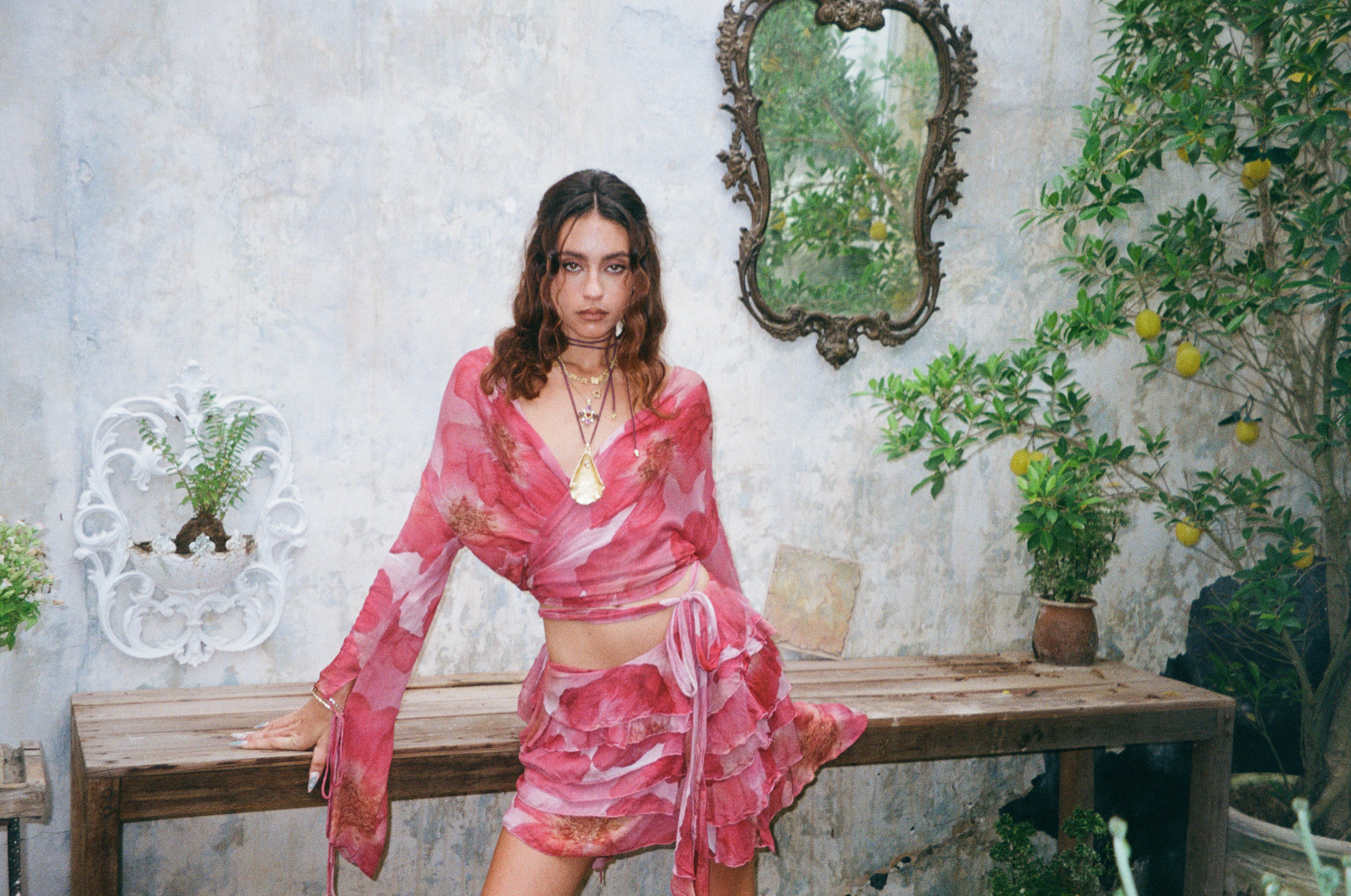 Designed to be worn as part of the full Kiss From A Rose set, she pairs perfectly with the matching wrap crop top for a look that feels catwalk-worthy and unforgettable.