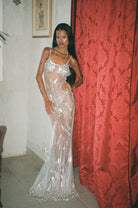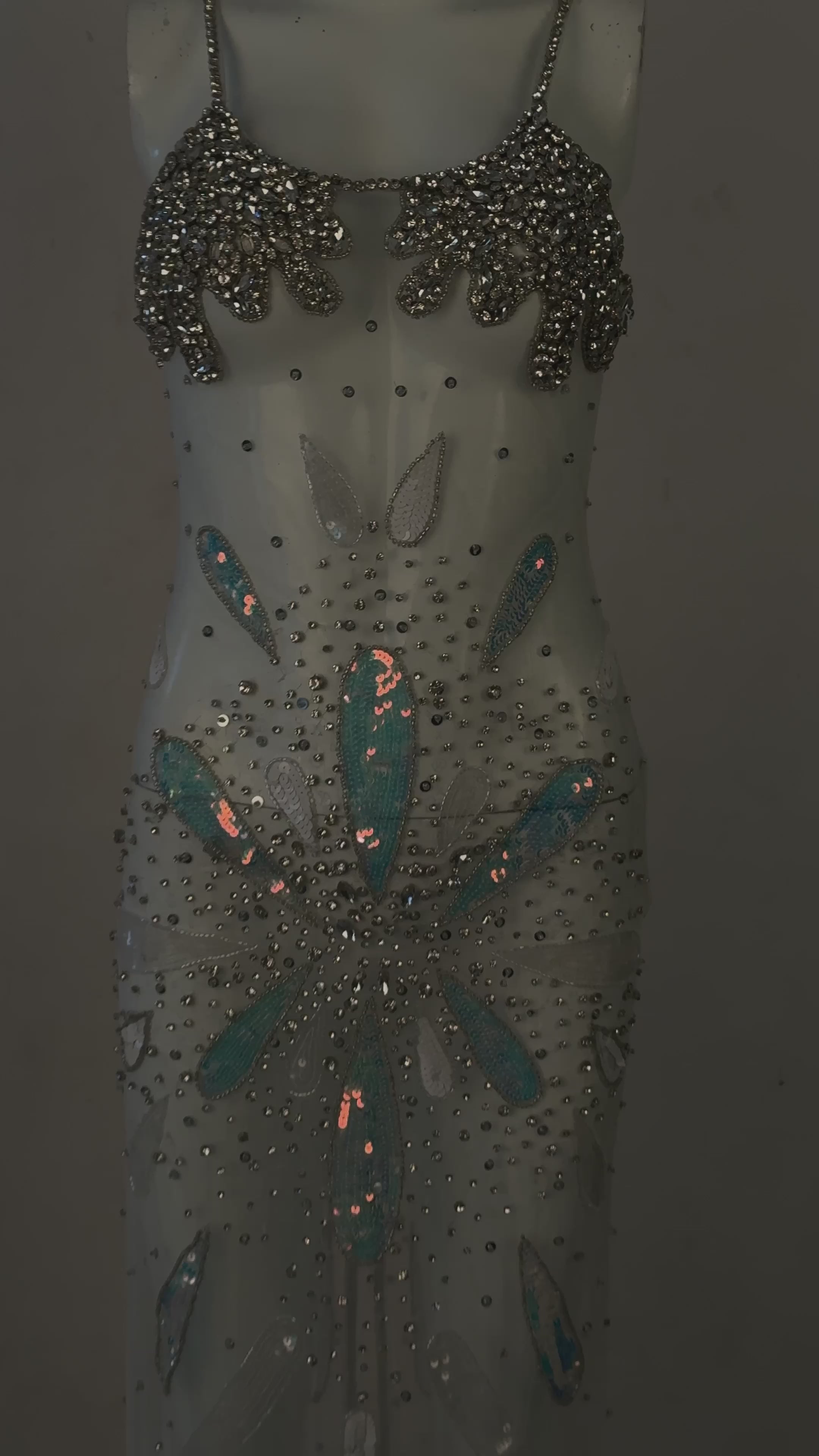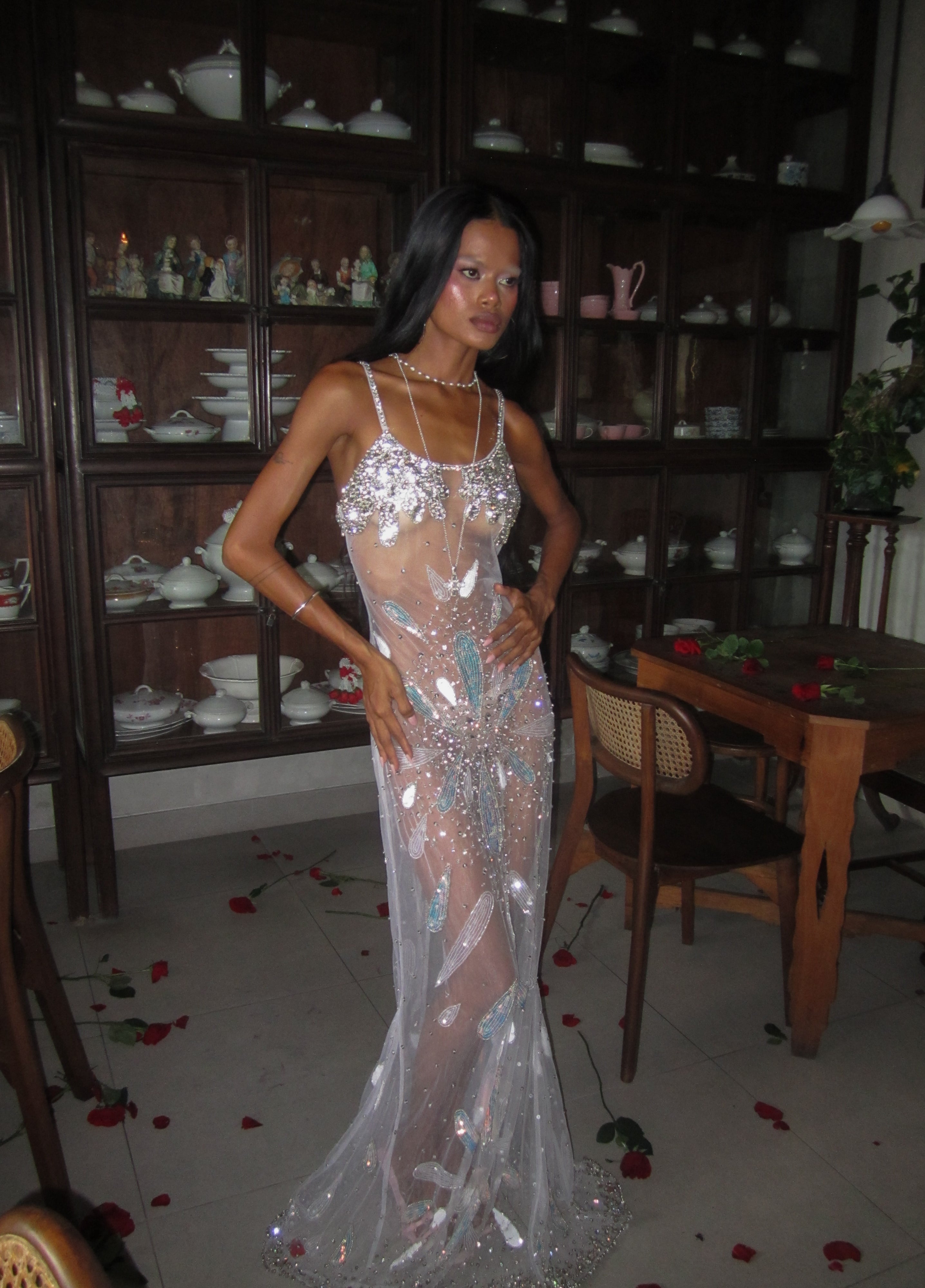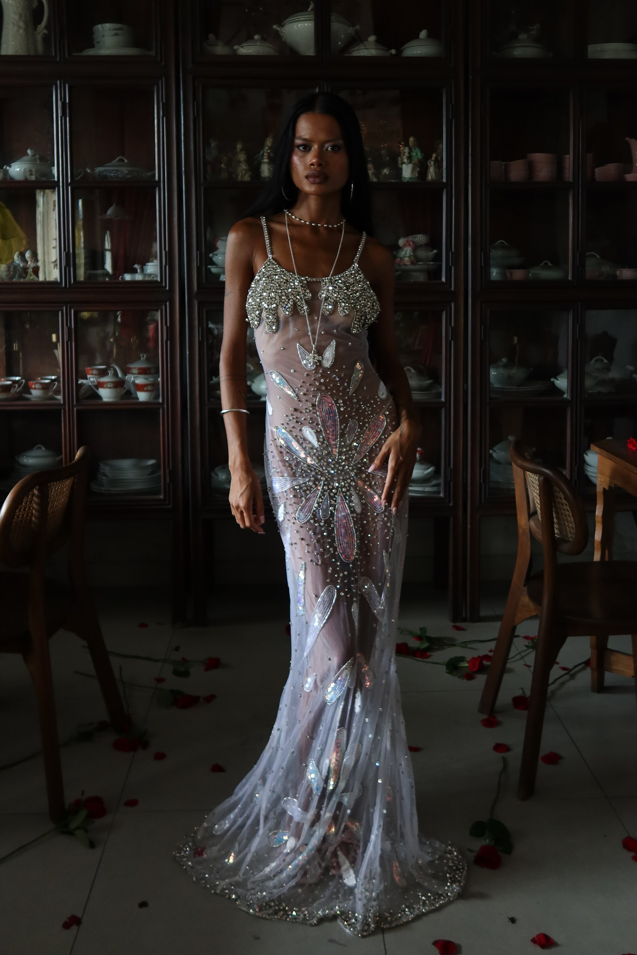 A second-skin illusion made for moonlit moments and impossible beauty.Please note, due to the intricate nature of the hand-sewn embellishment and the use of thousands of individually applied beads, it is normal for a small number of beads to loosen during transit. This is a natural characteristic of artisanal craftsmanship and does not affect the integrity, beauty, or appearance of the piece, which will arrive as pictured.
