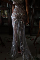 The Oceana Gown is a sheer, form sculpting dream, hand embellished with thousands of shimmering rhinestones and sequins that catch the light like waves beneath starlight. Each piece takes one week to hand craft, crafted as part of our bespoke collection and made to order only, a custom creation worth the wait.