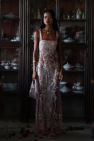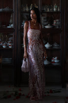 Step into a dream with the Goodbye Kiss Maxi Dress, crafted in soft pink sheer fabric and adorned with shimmering silver beading and sequins. Intricate butterfly motifs cascade across the body, each detail a quiet expression of artistry in motion.