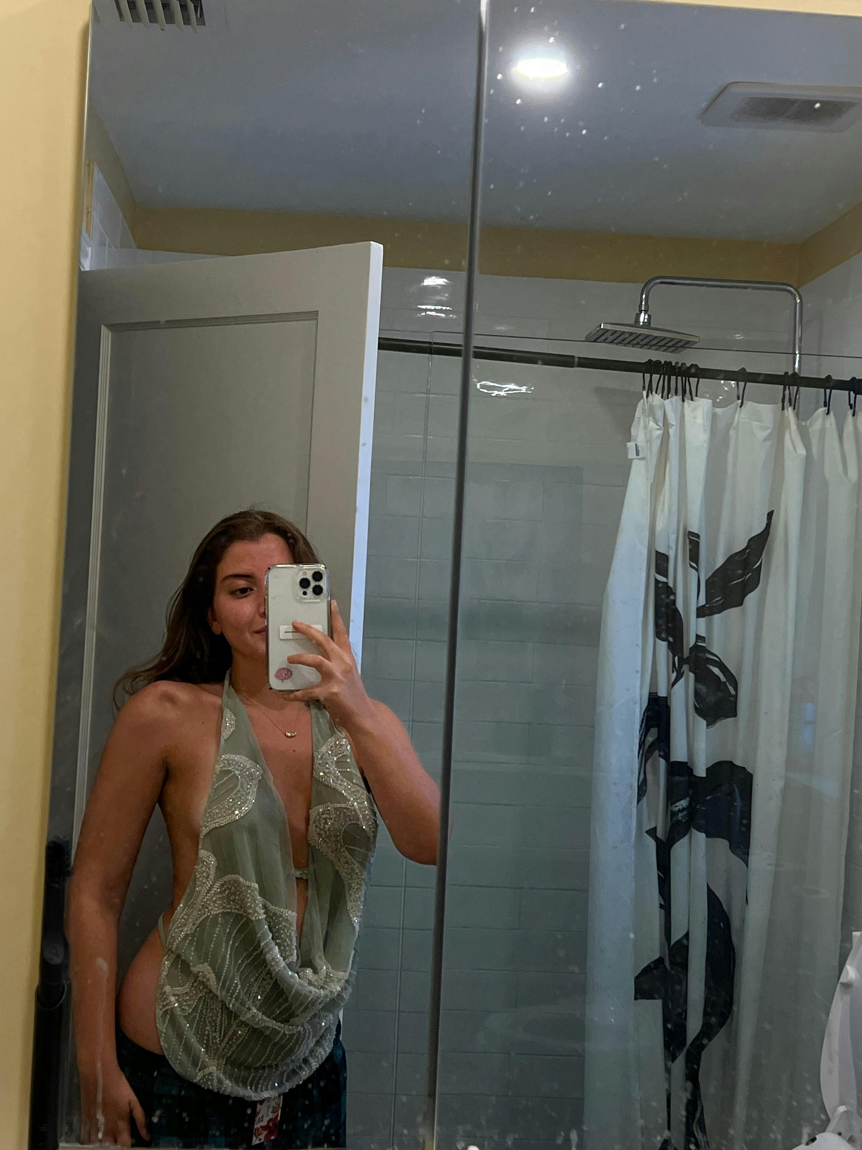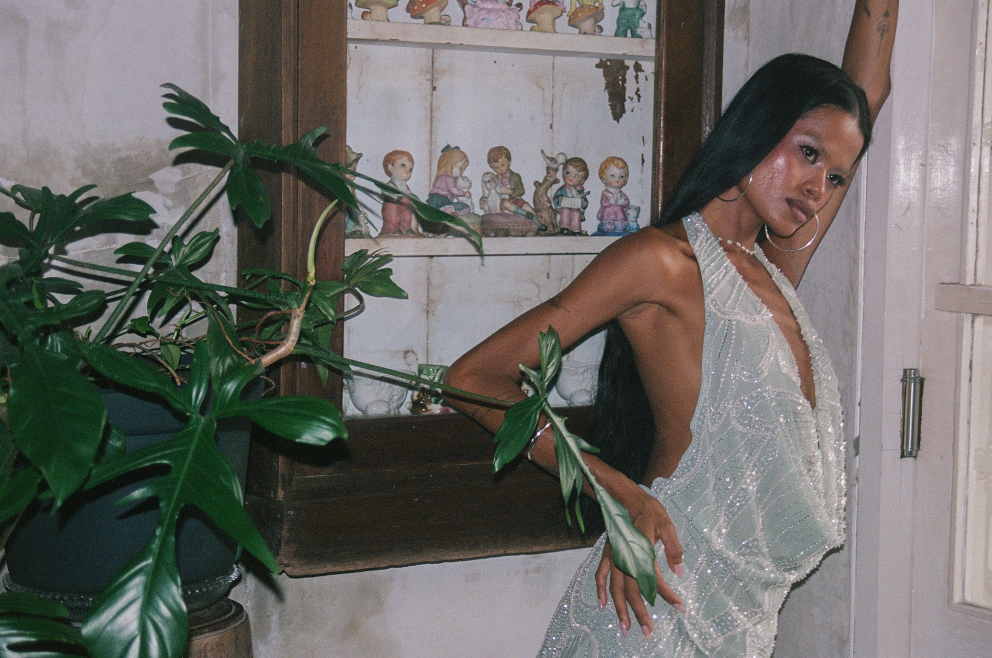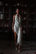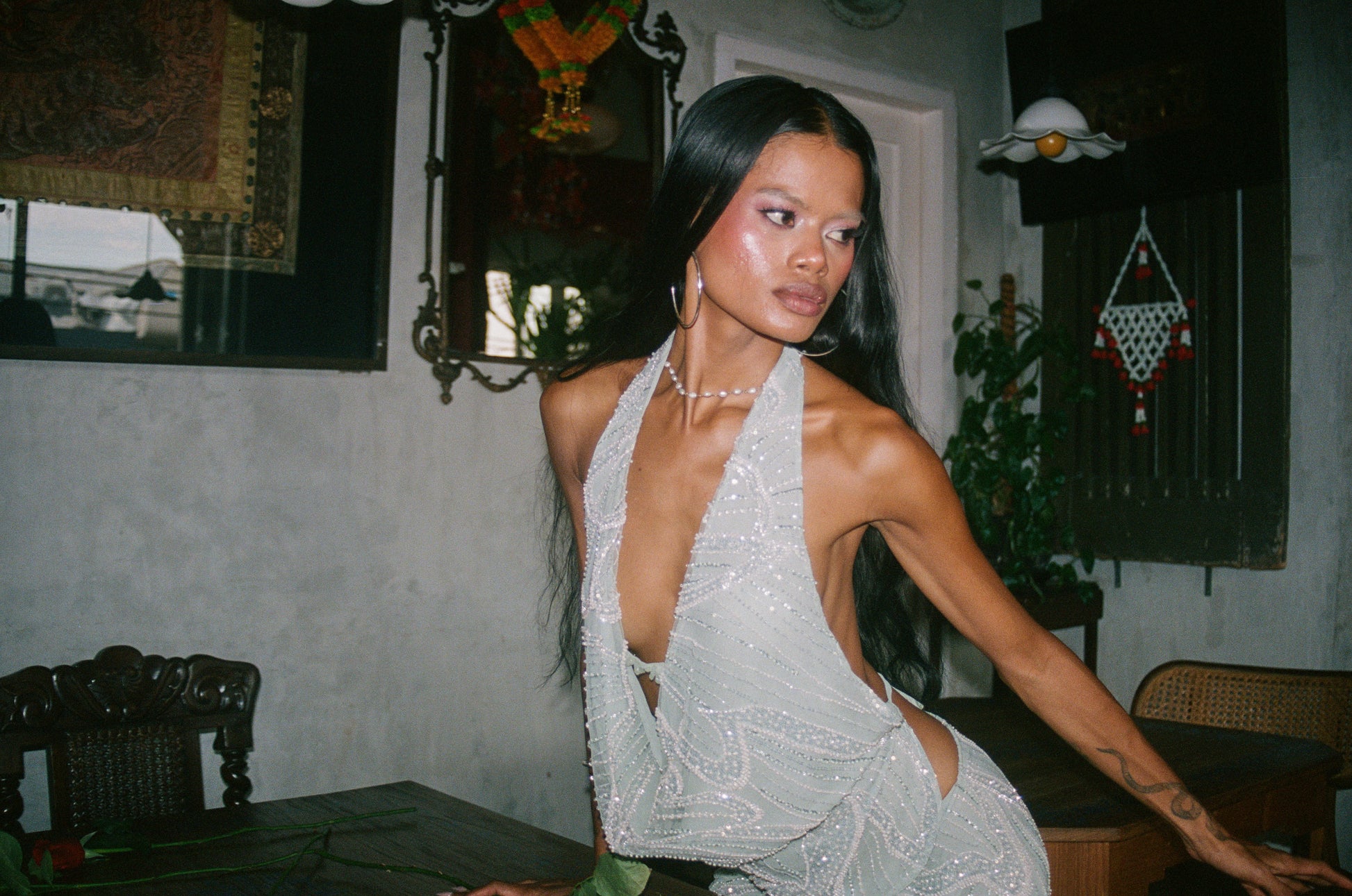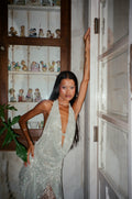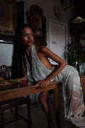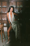 Crafted from an iridescent fabric, the Aquamarine Top reflects a sense of freedom and sensuality, draping gently across the body and glimmering with each movement. Its open tie-back design adds an element of sexiness, allowing the top to flow freely while enhancing the wearer’s silhouette.
