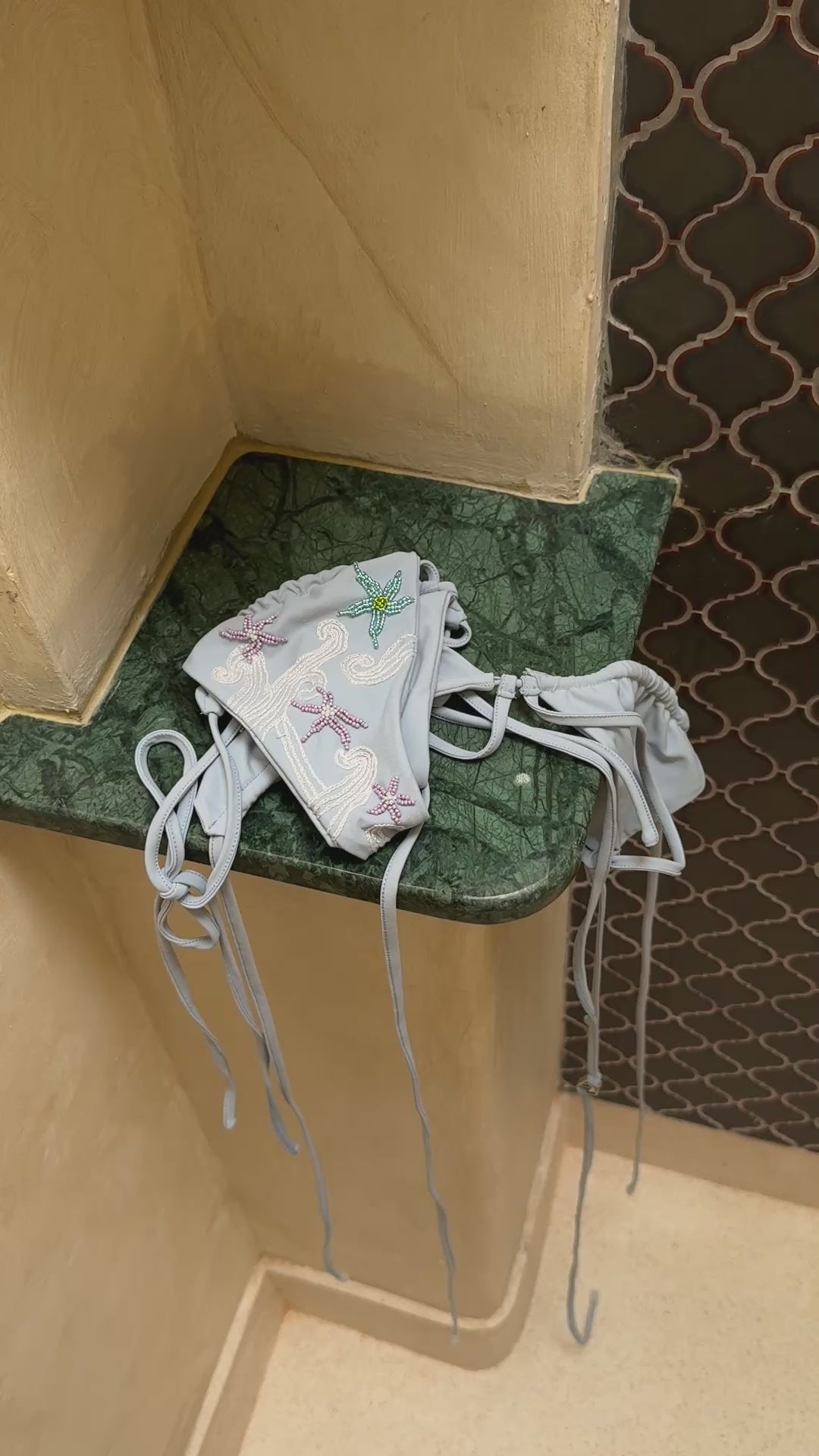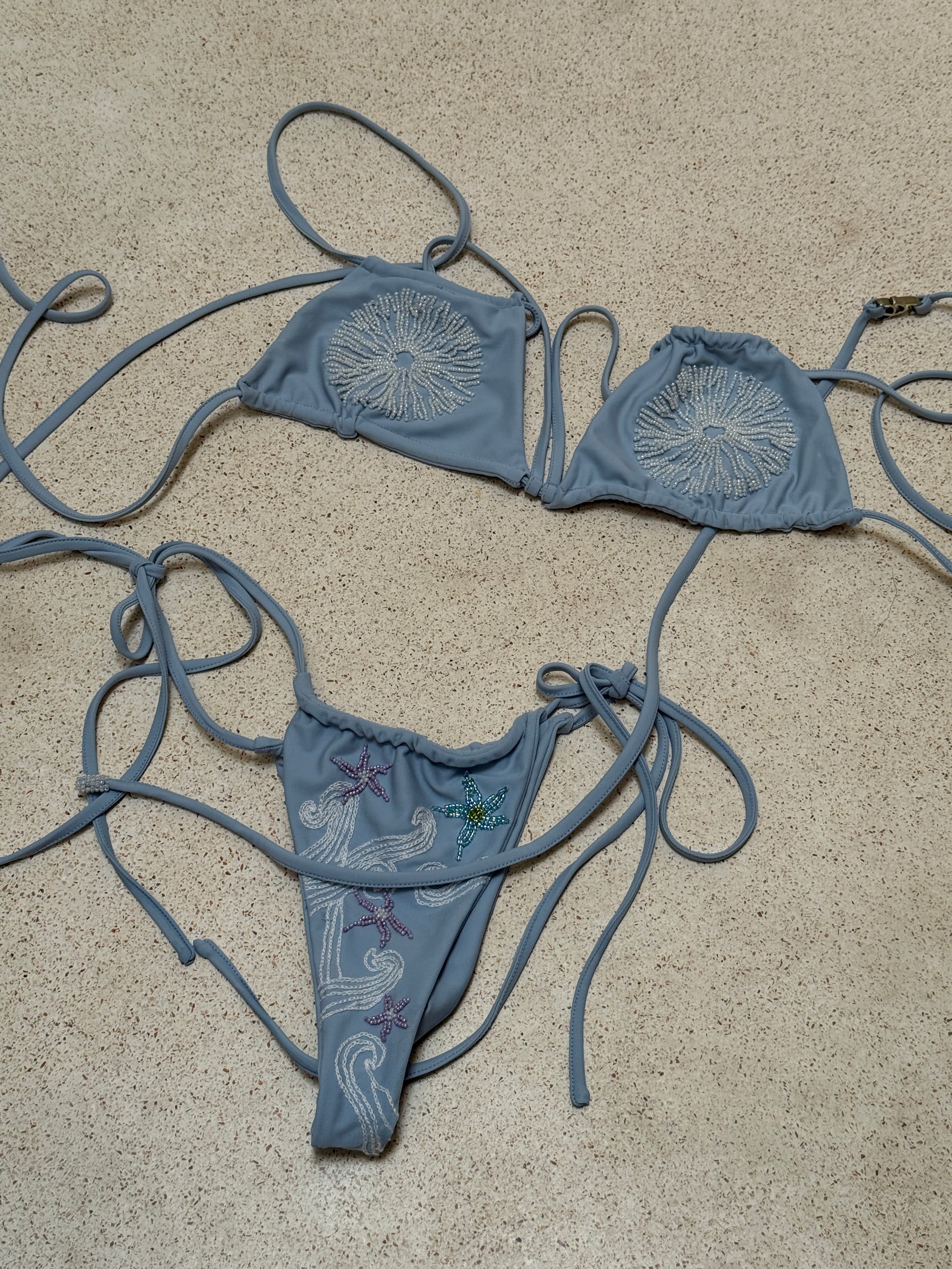 Drenched in dreamy minimalism and coastal charm — the Celestia Muse Bottoms feature an ultra-flattering high-cut silhouette and soft ruching that hugs like a sea breeze. Artisan embroidery brings to life coral-kissed starfish and shells, while tie sides add motion and fluidity with every step. A touch of ocean magic, designed to glisten under sun and moon alike.