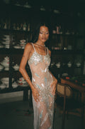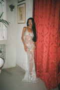 The Oceana Gown is a sheer, form-sculpting dream — hand-embellished with thousands of shimmering rhinestones and sequins that catch the light like waves under starlight. Crafted as part of our bespoke collection, this piece is made to order only — a custom creation that’s worth the wait.