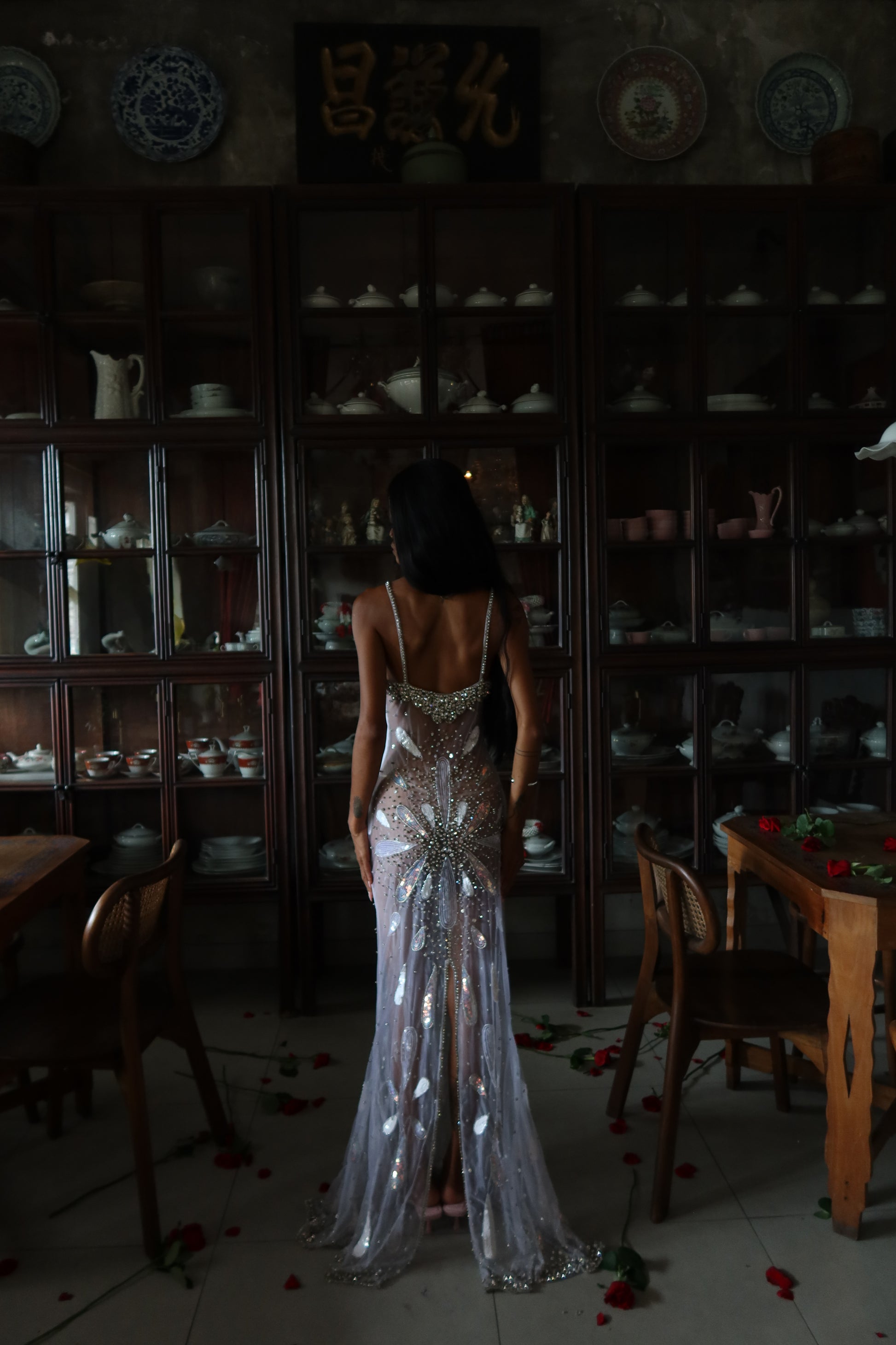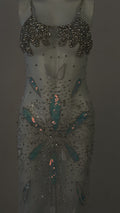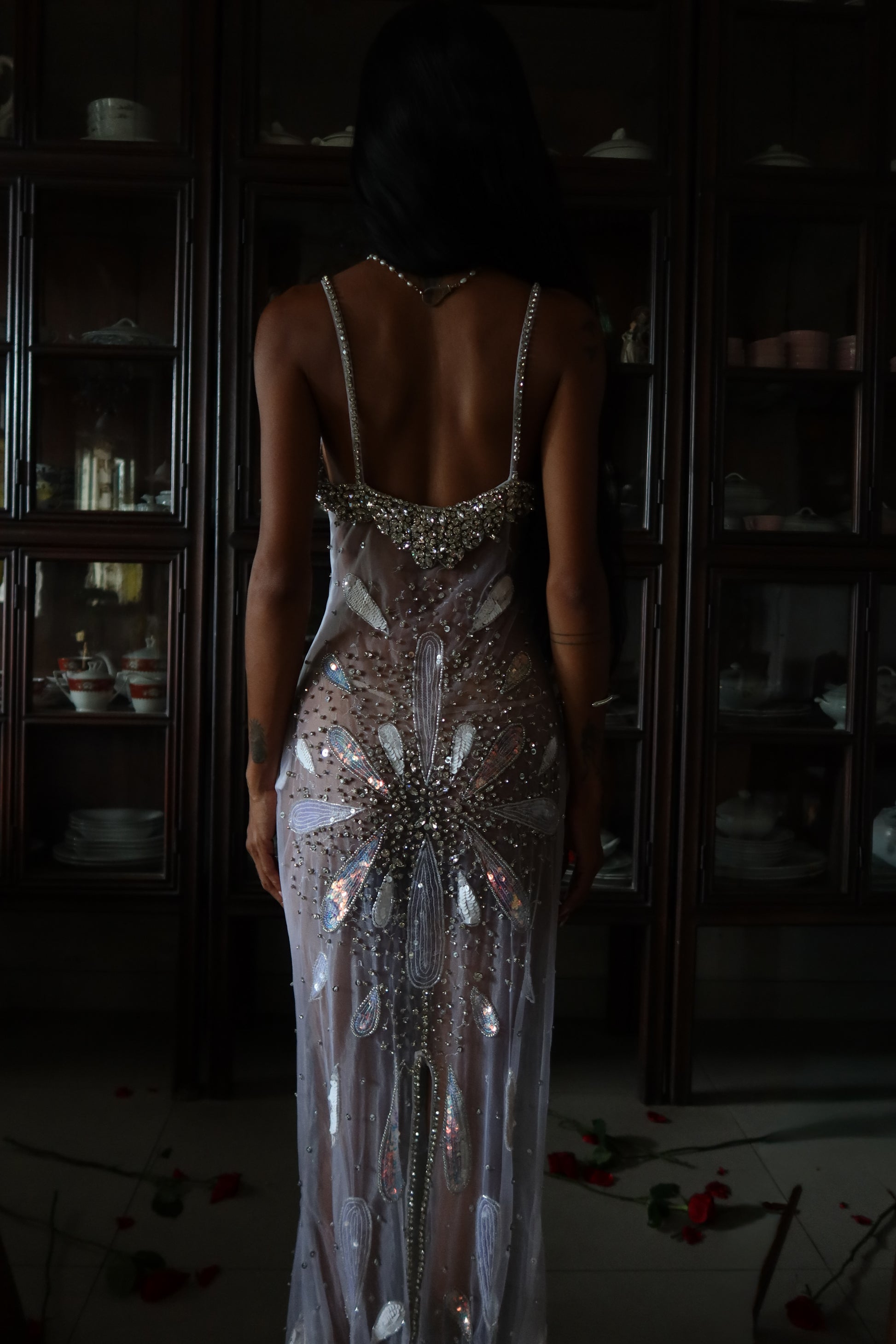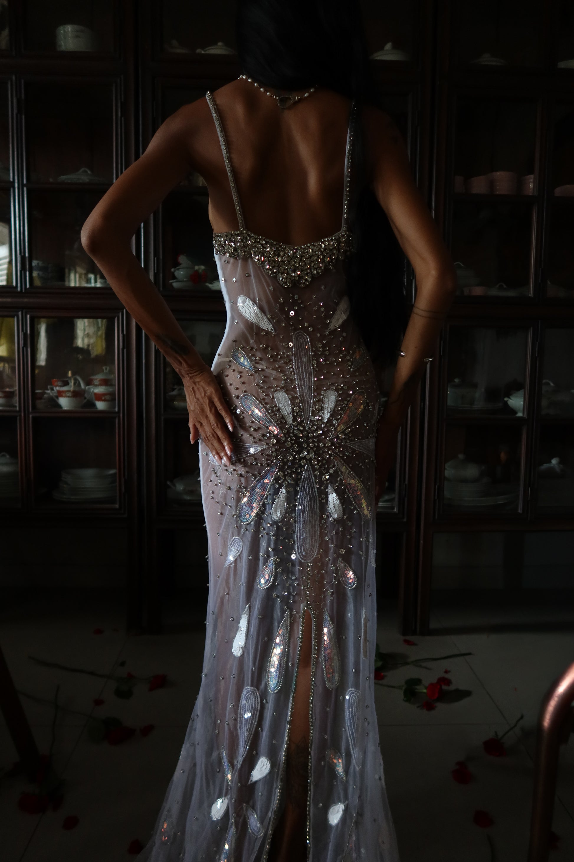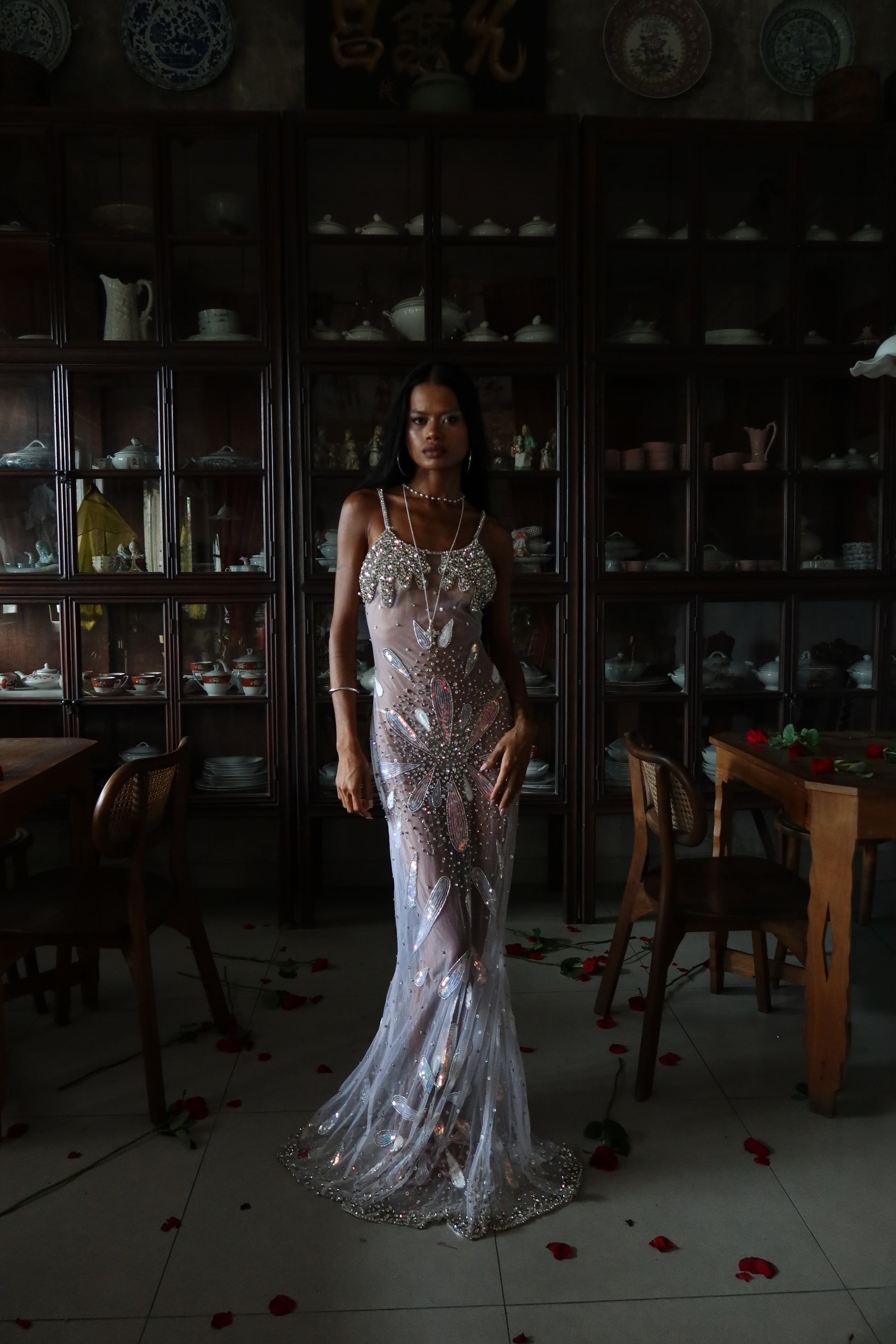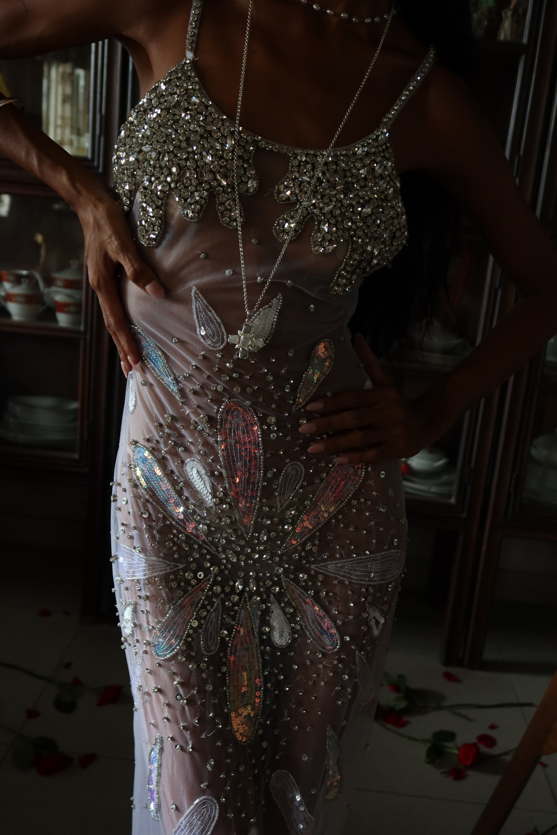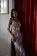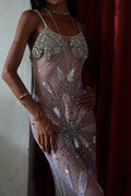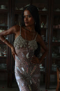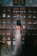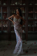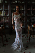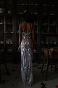 Inspired by the ocean’s divine goddess energy, silver-white iridescence ripples across the body like liquid light, with a draped fishtail silhouette that hugs every curve before flaring with a soft back slit for movement and drama.