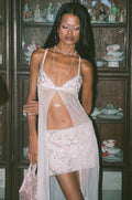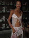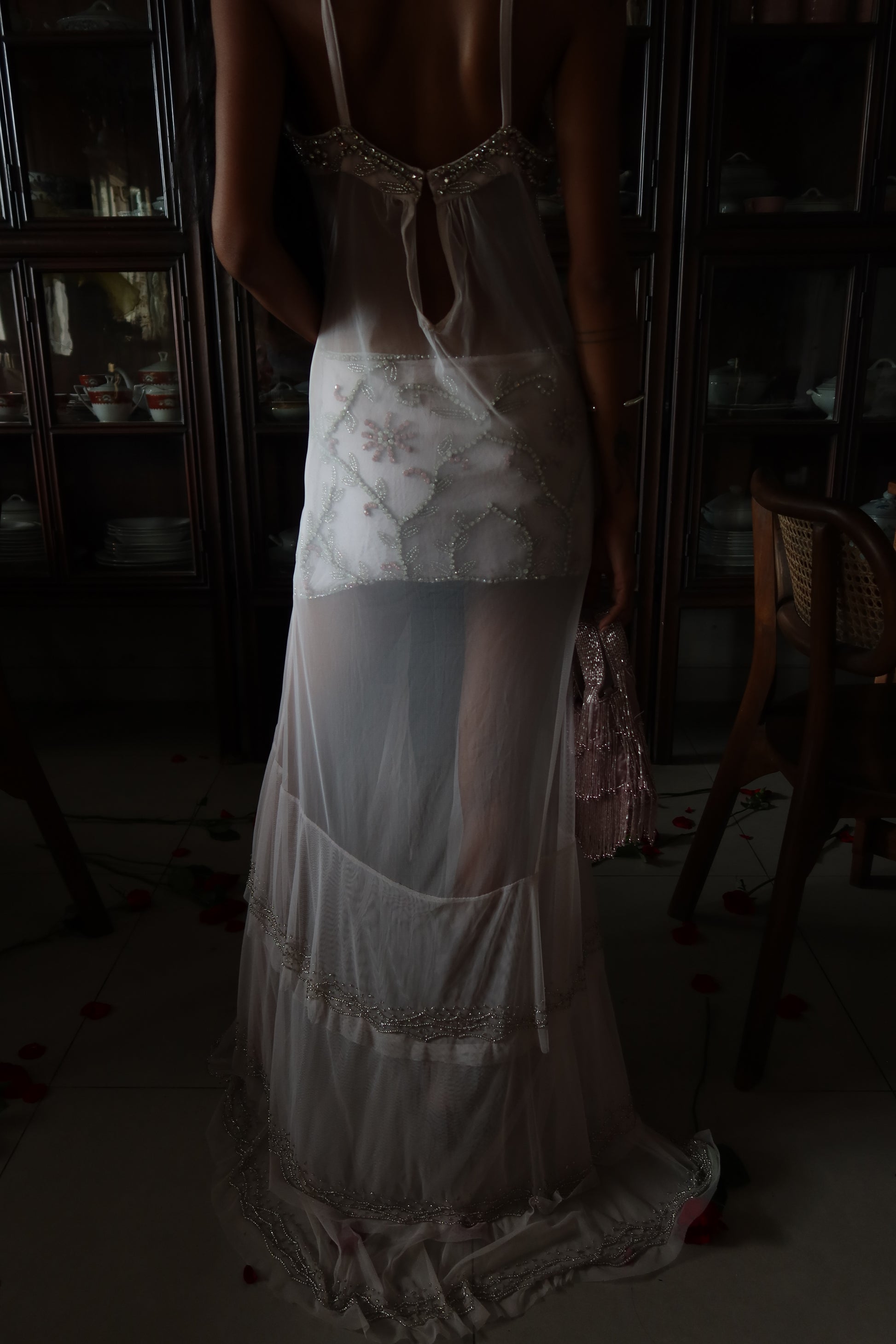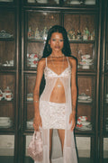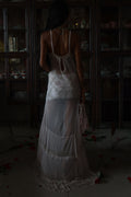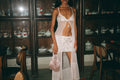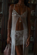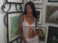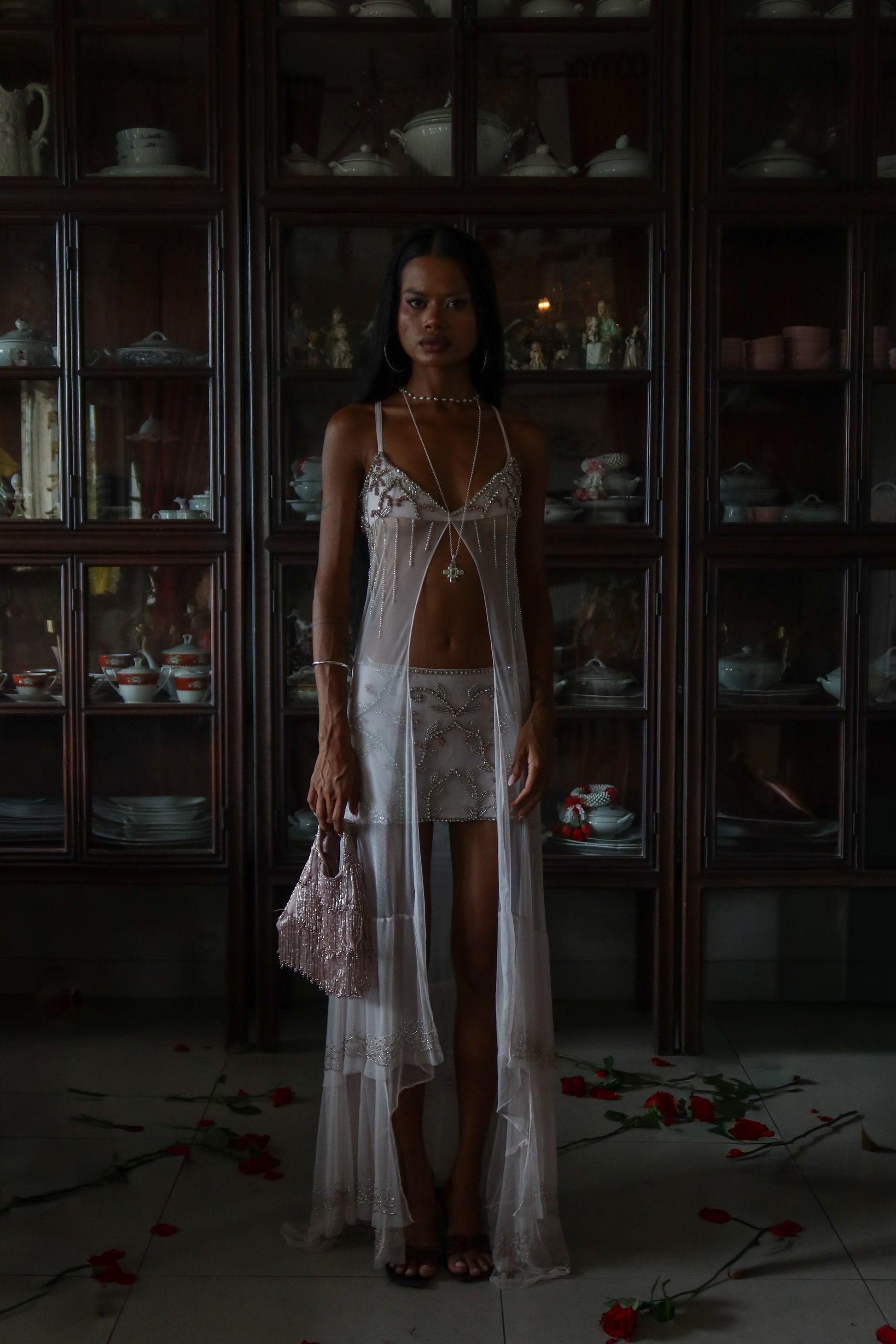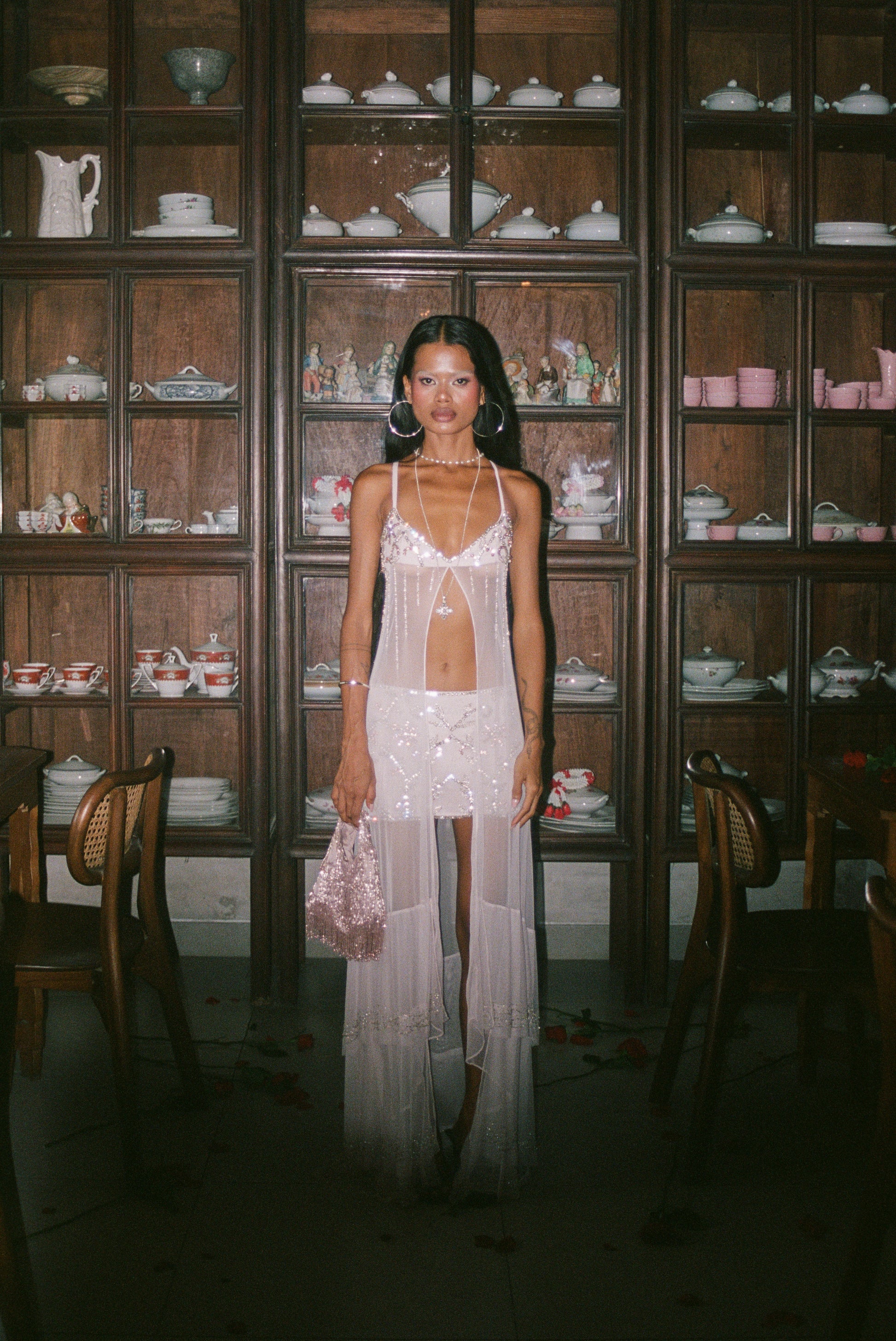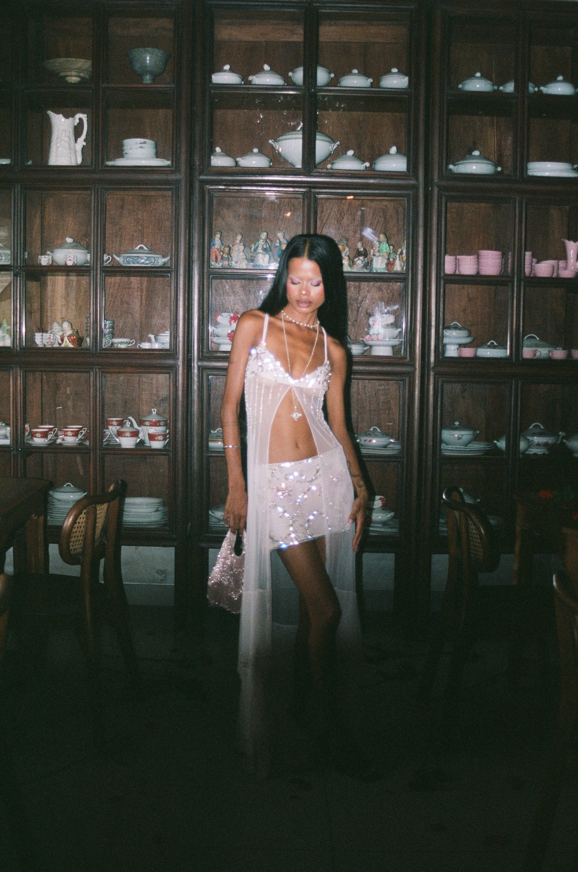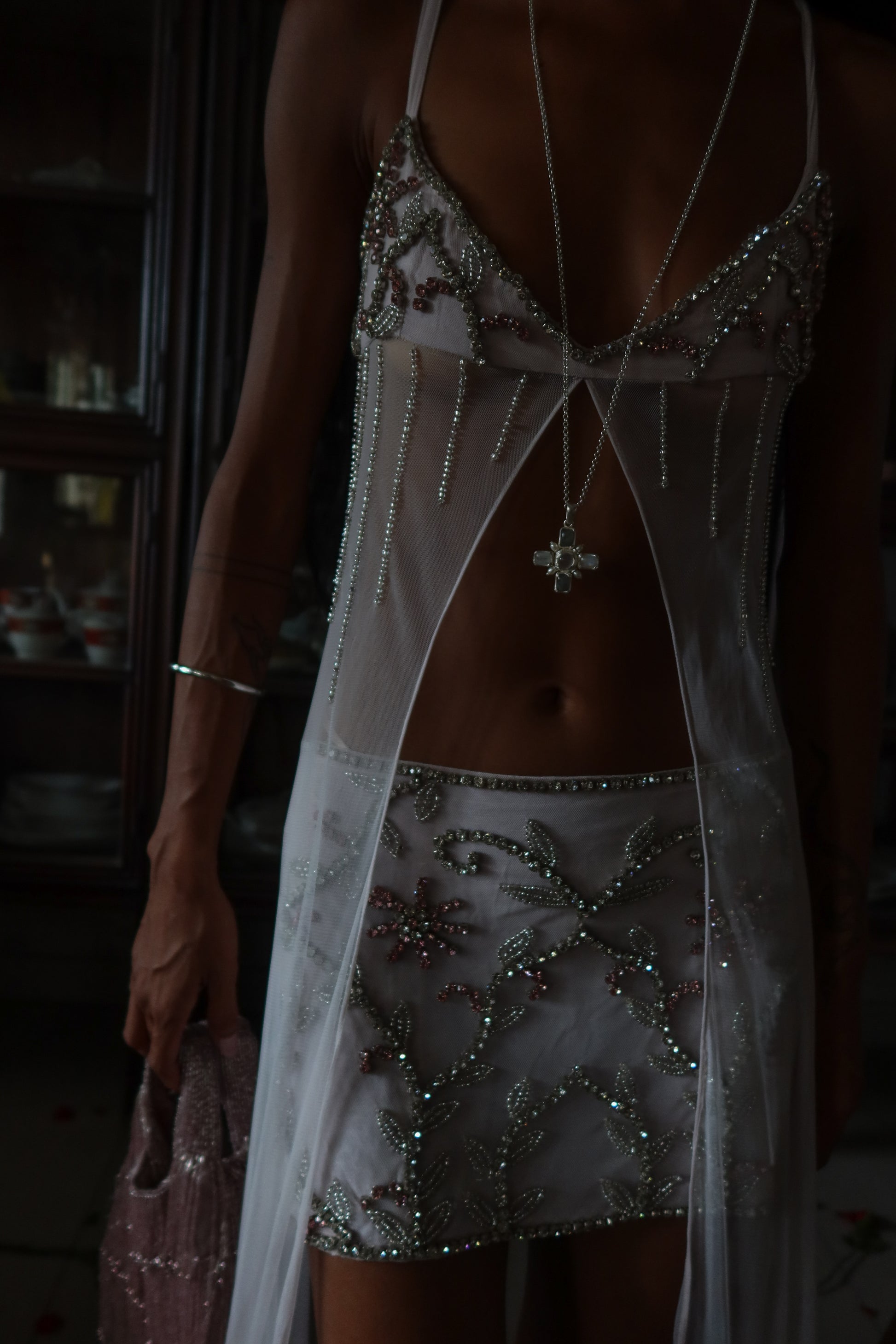 The micro mini skirt stuns with a custom rhinestone motif, catching the light like sunlight on saltwater. Paired with a matching bra gown, the look is elevated by three cascading frilled details, reminiscent of ocean waves tumbling over one another — each frill adorned with hand-applied embellishments for a fluid, goddess-like finish.