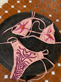 Pair up to complete the set with the Starborn Tides Bottoms and matching chiffon-beaded Starborn Tides Tie Skirt — the Starborn Tides set reimagined for sea goddesses. Embellished with radiant starfish hand-beading and glistening coral-hued threadwork, this top channels celestial reef energy. Adorned with delicate, real seashell drops at the center front, every detail is kissed by the tide. With its blush canvas and vivid fuchsia accents, this piece captures the pulse of the ocean at dusk — sultry, soft, and spellbinding.