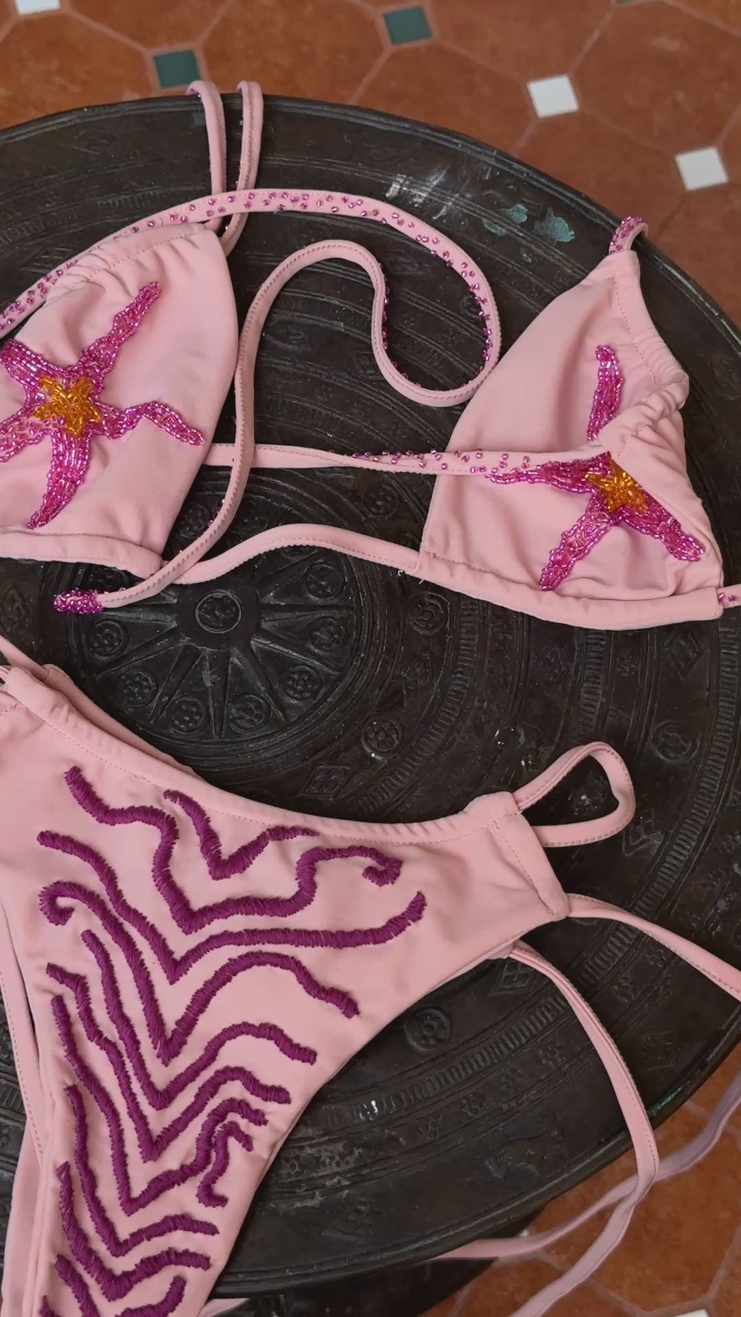 Pair up to complete the set with the Starborn Tides Bikini Top and matching chiffon-beaded Starborn Tides Tie Skirt — the Starborn Tides set reimagined for sea goddesses. Embellished with radiant starfish hand-beading and glistening coral-hued threadwork, this top channels celestial reef energy. Adorned with delicate, real seashell drops at the center front, every detail is kissed by the tide. With its blush canvas and vivid fuchsia accents, this piece captures the pulse of the ocean at dusk — sultry, soft, and spellbinding.
